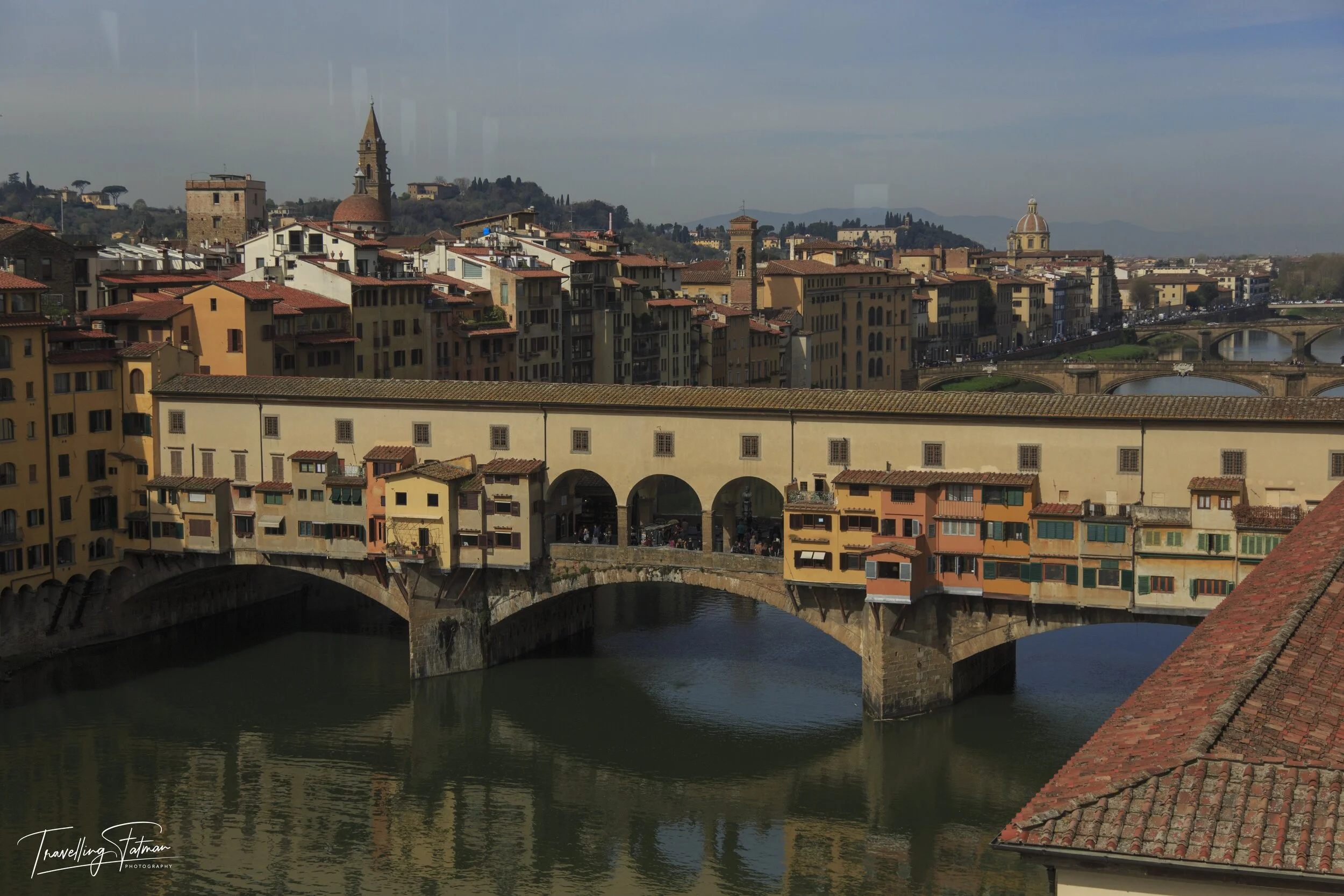 OK, hands up here, full confession time. This shot has some reflections in it - you can see them in the sky. This was taken through a window in the Uffizi Museum. This is, of course, the famous Ponte Vecchio and I thought the shot worth sharing, despite the flaws. From Wikipedia, “The Ponte Vecchio is a medieval stone closed-spandrel segmental arch bridge over the Arno River, in Florence, Italy. It is noted for the shops built along it, as was once common. Butchers, tanners, and farmers initially occupied the shops; the present tenants are jewellers, art dealers, and souvenir sellers.” (Canon)